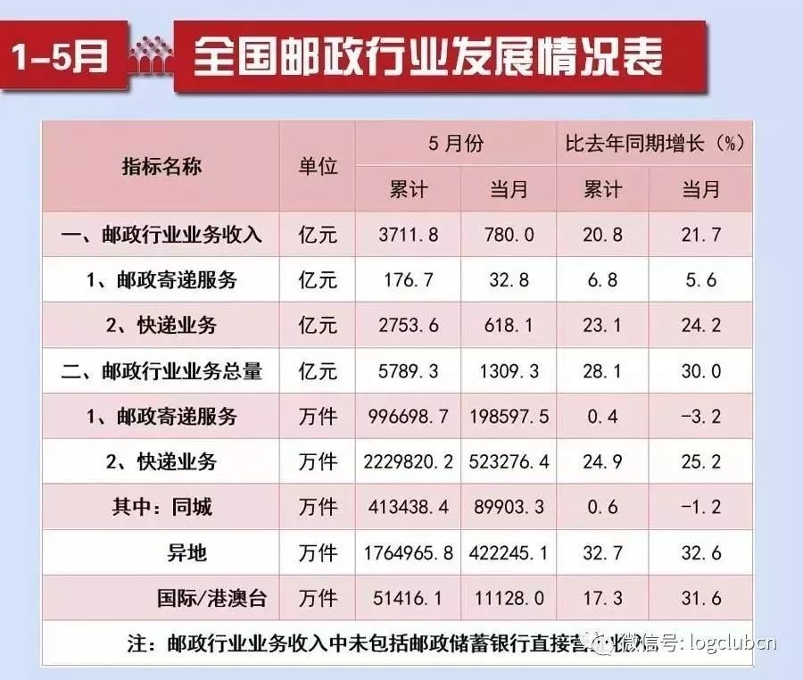1-5月份,全国快递服务企业业务量累计完成223亿件,同比增长24.9%;业务收入累计完成2753.6亿元,同比增长23.1%。5月份,全国快递服务企业业务量完成52.3亿件,同比增长25.2%;业务收入完成618.1亿元,同比增长24.2%。