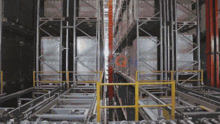 成品智能电视下产线后进入滚筒输送,经由自动裹膜机完成裹膜,拆码盘机根据系统信息精准进行空托盘拆分,随后由机械臂进行成品码垛。成品托盘输送至存储区域,24米通高立库,一期设计5580个货位,5台巷道堆垛机,针对智能电视的不同尺寸区别规划,完成不同大小成品的入库存储。同时在实际操作流程中,根据库前实时流量进行合理分散与计划,提高效能的同时大大降低设备瓶颈。7*24h实时监控,双机热备存储数据,实现流程可视与远程检修,安全又可靠。